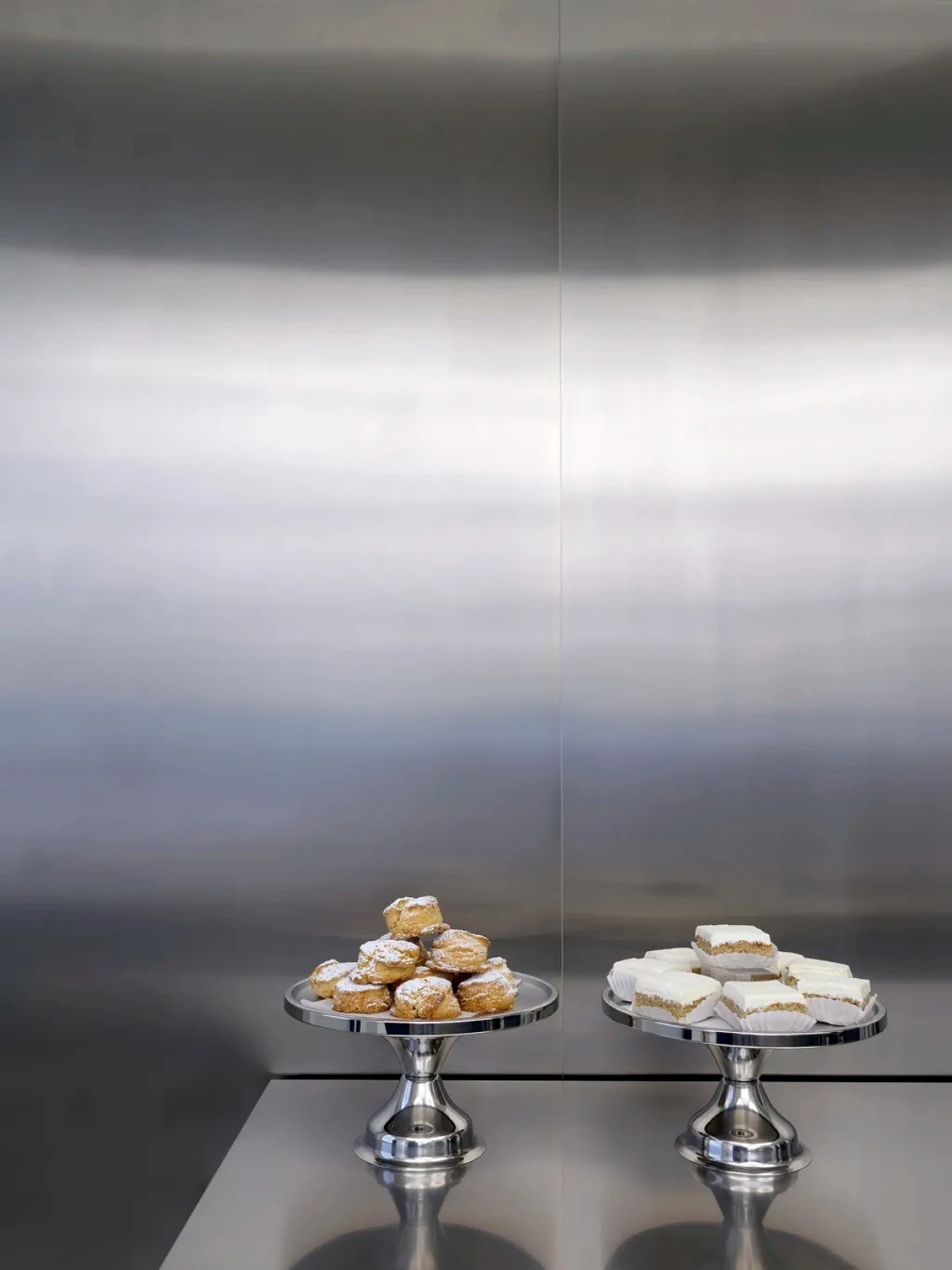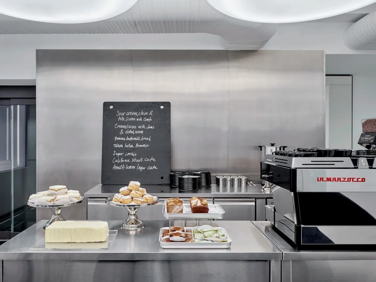Uz knjižaru, nalazi se kafić uređen u suradnji s Claire Ptak, vlasnicom Violet Cakes i slastičarkom poznatom po izradi svadbene torte vojvode i vojvotkinje od Sussexa. Na meniju se nalaze razne delicije koje posjetitelji mogu konzumirati u elegantnom interijeru od čelika. Minimalistička estetika prostora diskretno odaje počast naslijeđu preminulog dizajnera, dok ujedno stvara suvremeno mjesto za okupljanje.
