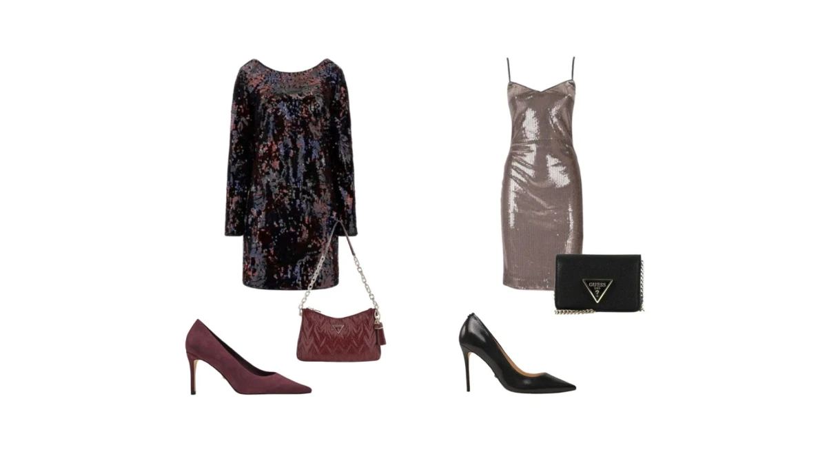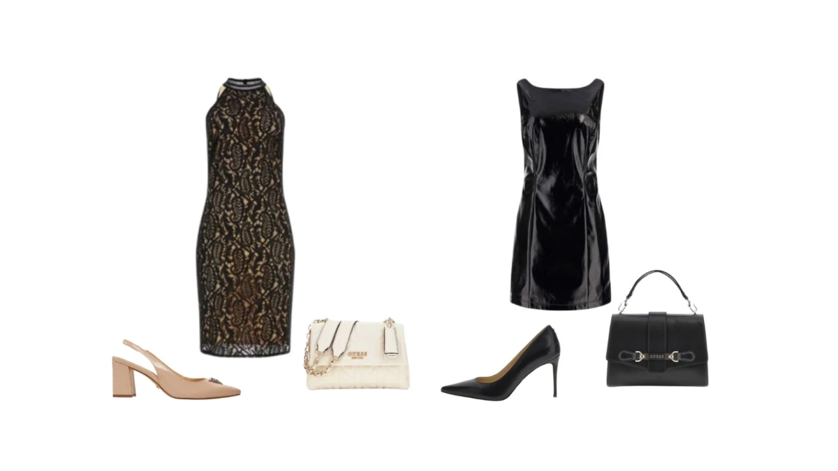 Guess haljine iz ovogodišnje kolekcije prilagođene su raznim prigodama, od svečanih večera do večernjih izlazaka. Za suptilan i klasičan izgled, predlažemo midi čipkastu haljinu koja zrači stilom i profinjenošću. Neutralne salonke i torbica u bež tonu nadopunjuju outfit, stvarajući skladan i uravnotežen dojam. Za naglašen izgled, crna mini haljina od vinila ističe se sjajnim detaljima i suvremenim dizajnom. Crne salonke i torba u istoj nijansi završni su dodatak za kompletan party look.