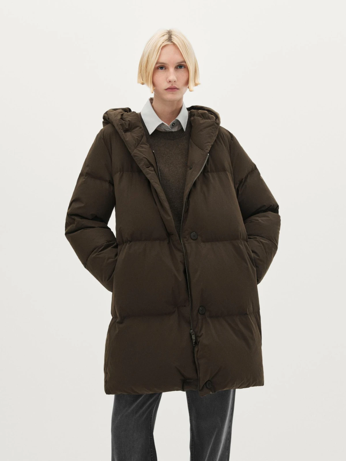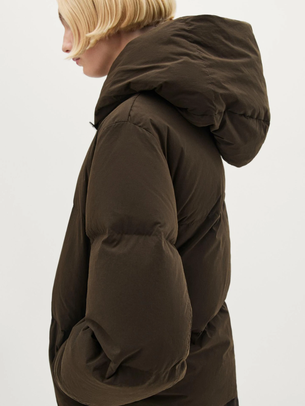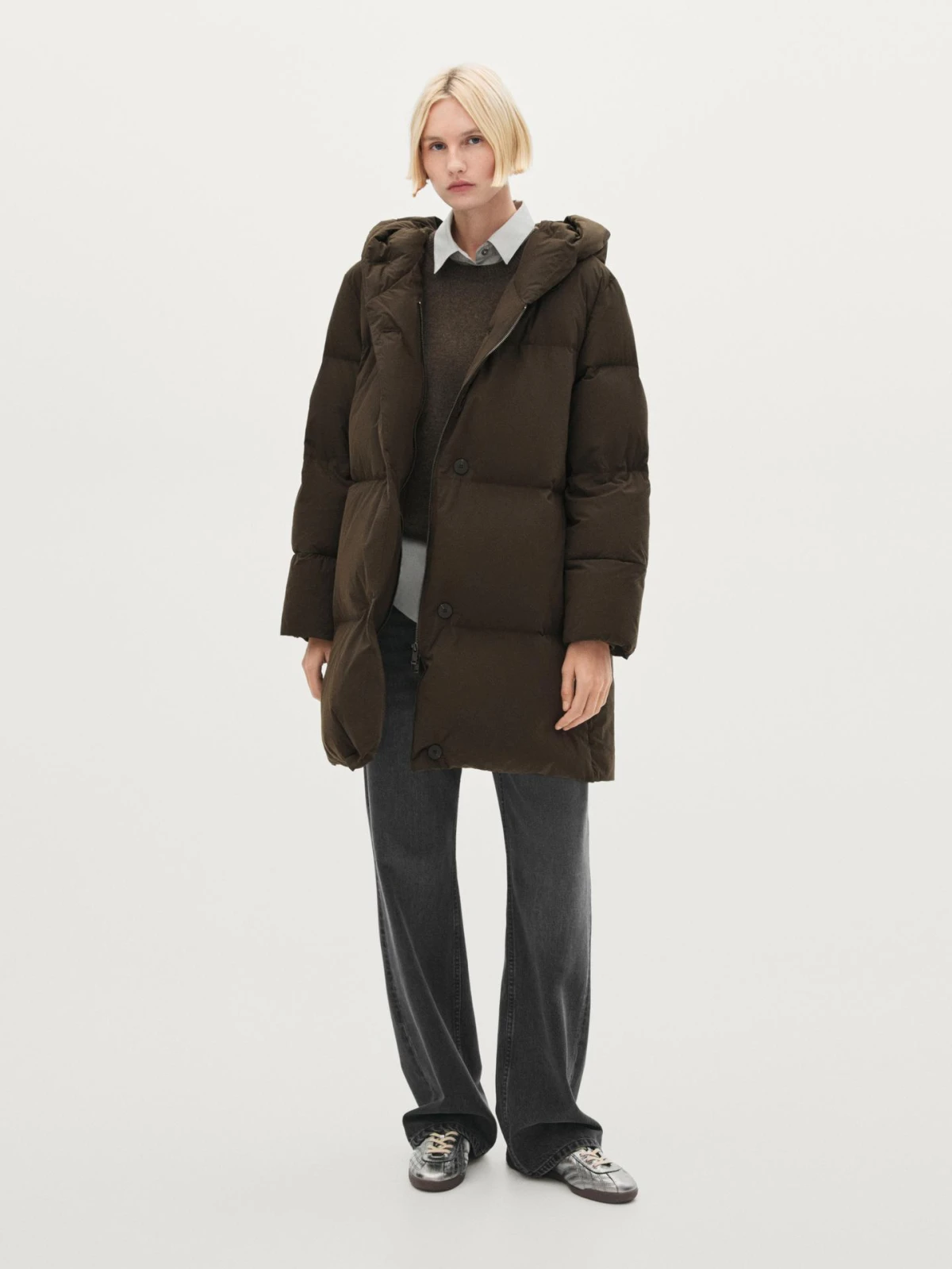 Na sreću, u Massimo Duttiju smo pronašli pernatu jaknu s kapuljačom koja je topla, a opet vizualno atraktivna, Ova smeđa poluduga jakna ima visoki ovratnik s kapuljačom, dva bočna džepa i elastični gumeni detalj na manžetama i donjem dijelu. Punjena je podstavom od perja, a dostupna je po cijeni od 189 eura.