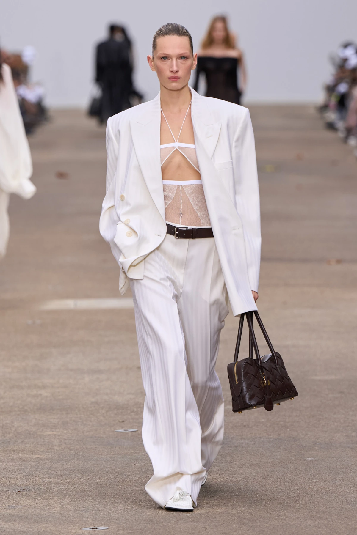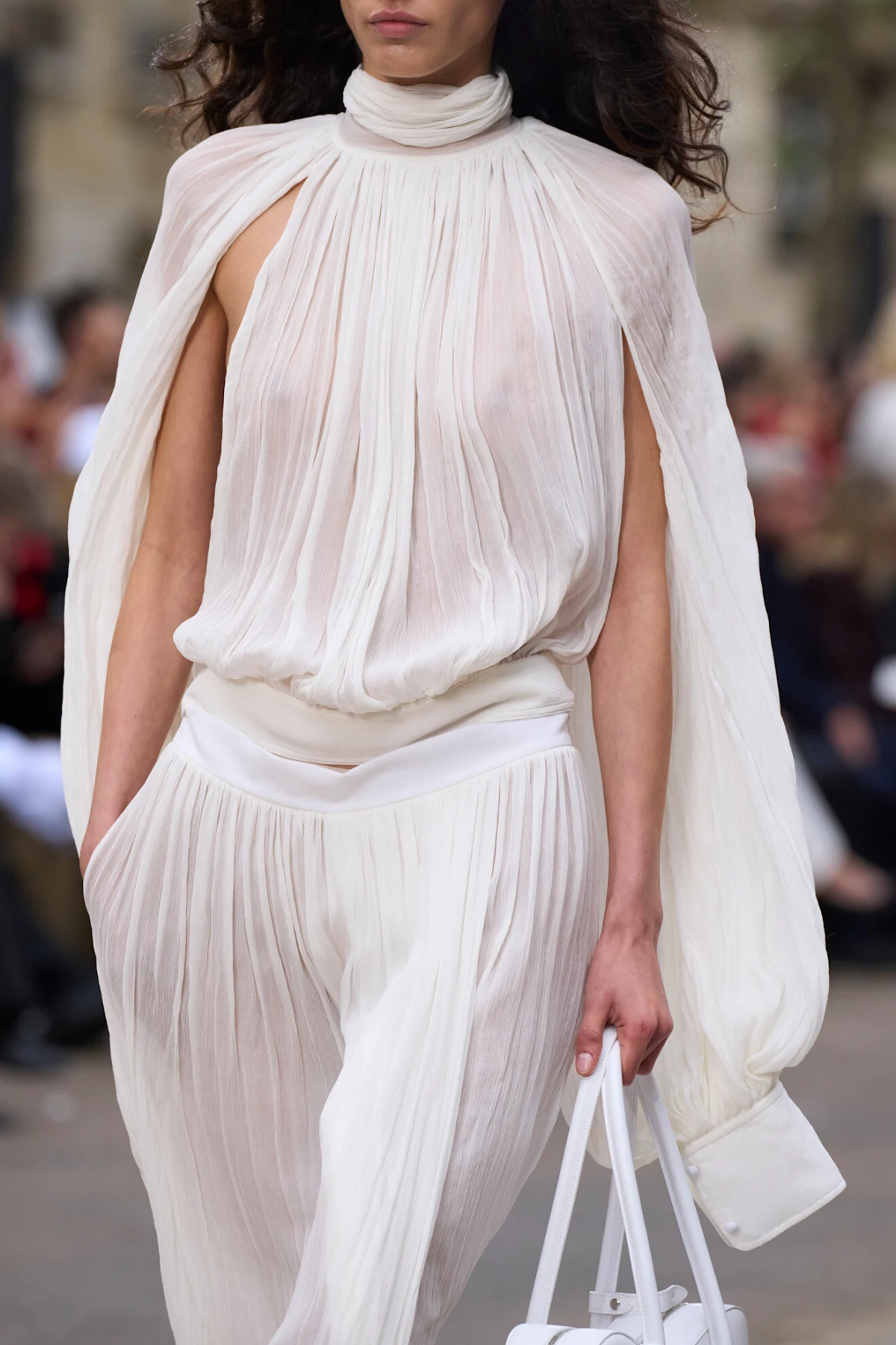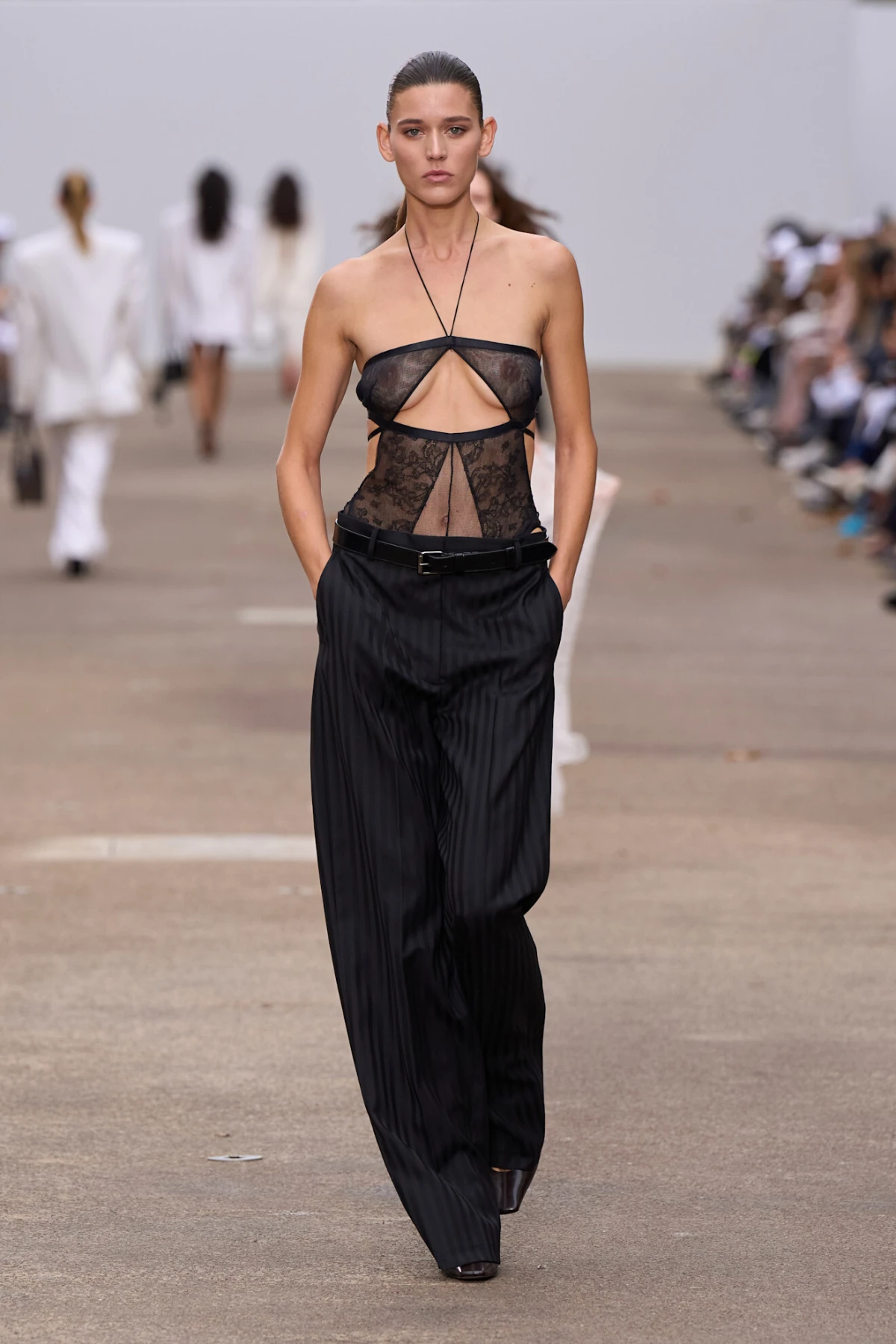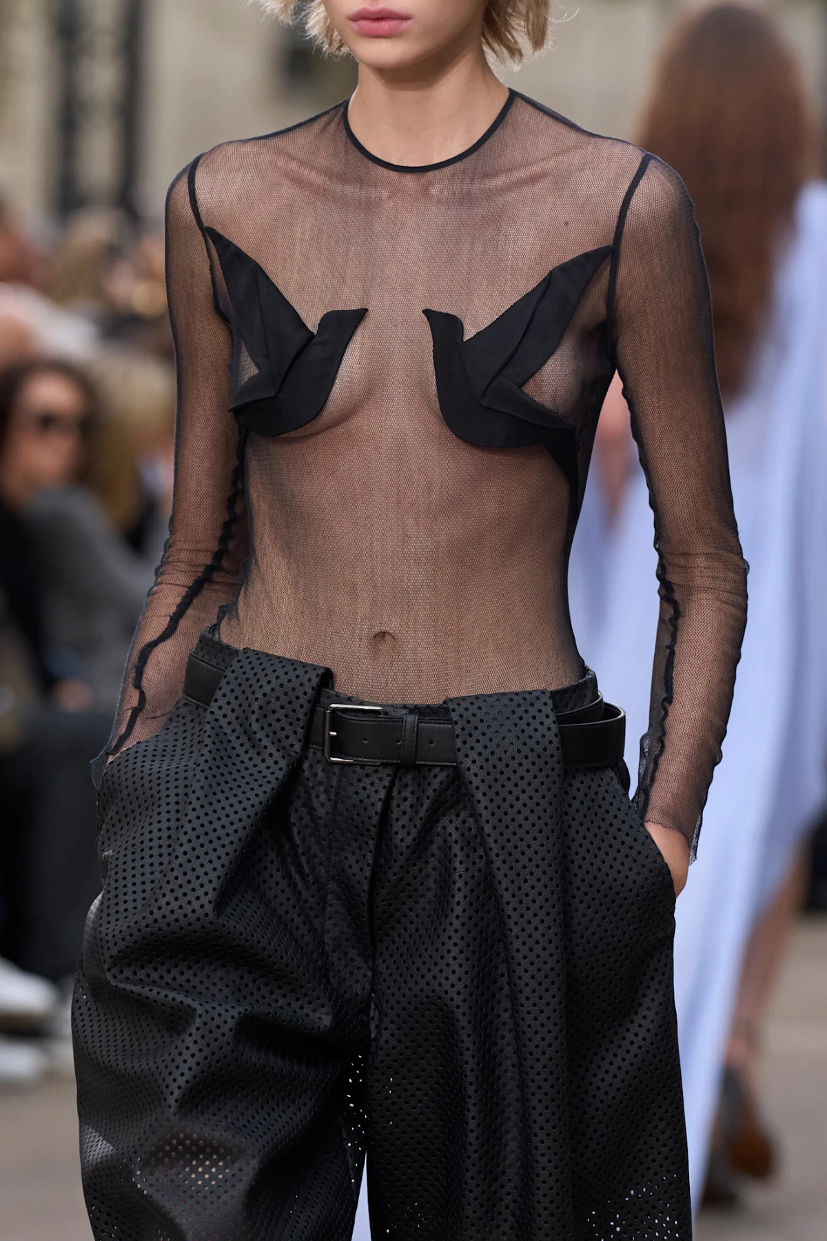 Budite odvažni s monokromatskim outfitom u kojem prozirni gornji dio vodi glavnu riječ. Kombinirajte prozirnu bluzu s odgovarajućim grudnjakom i hlačama, a izgled upotpunite minimalnim dodacima za uglađen stil.