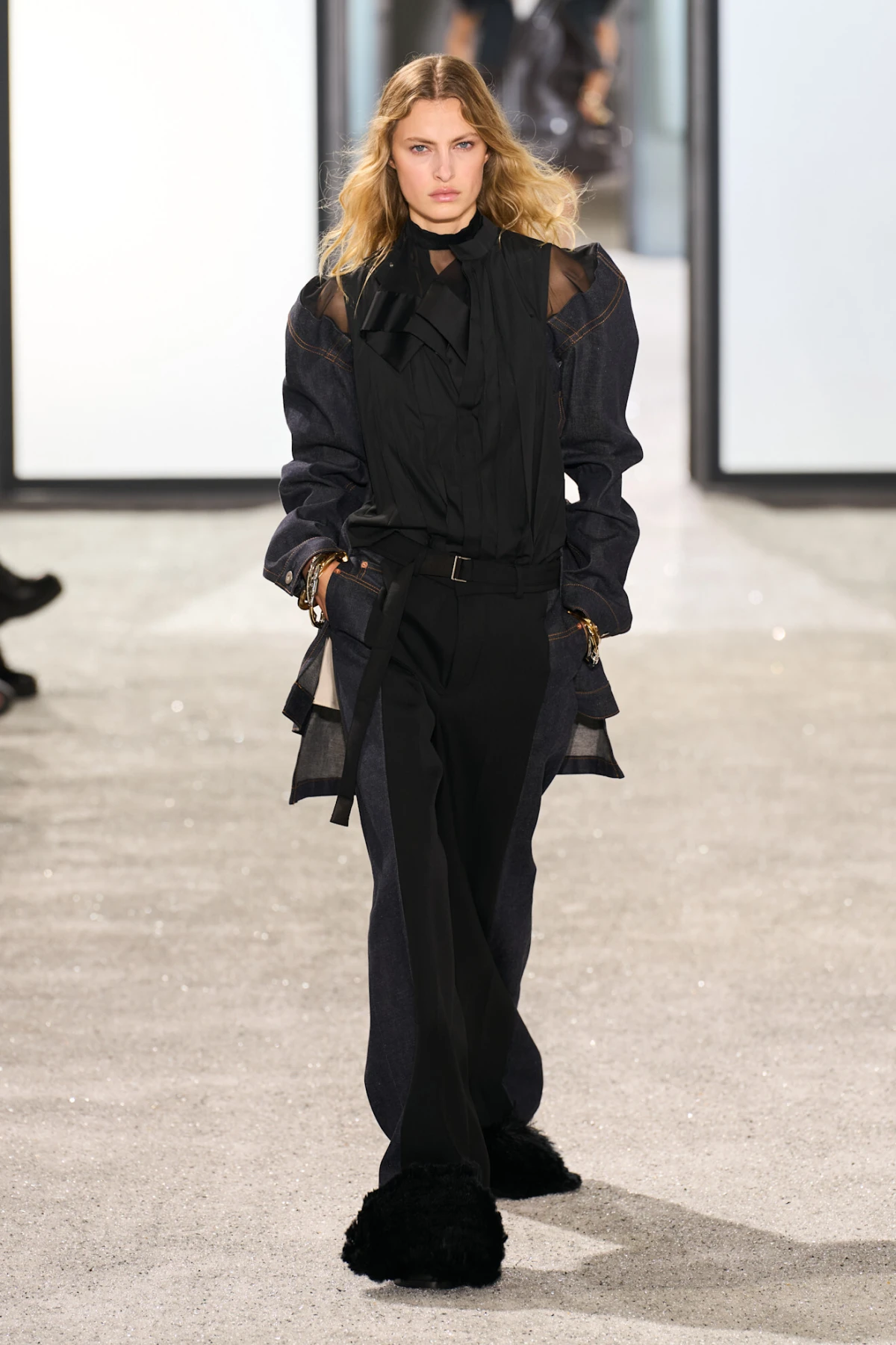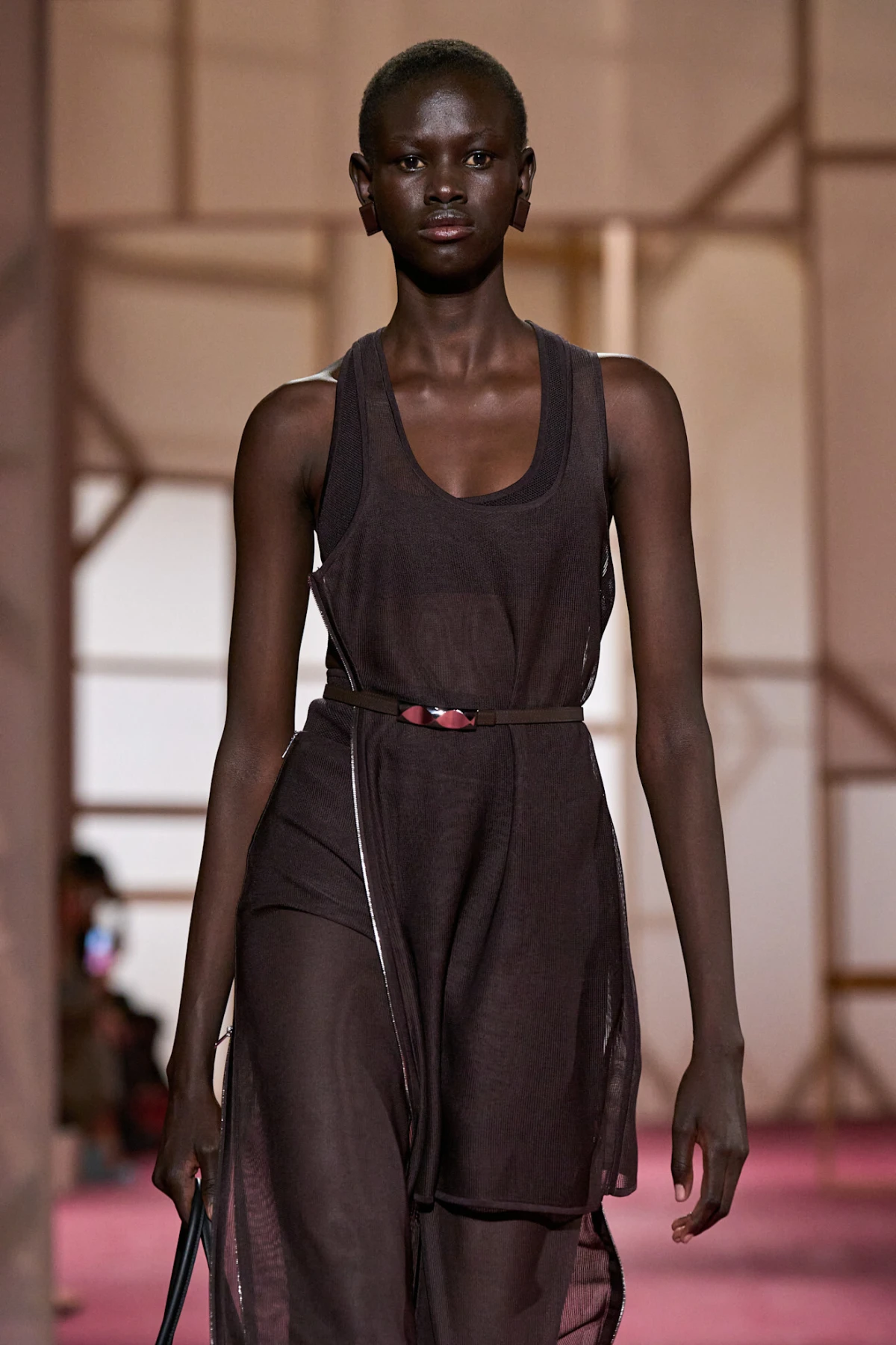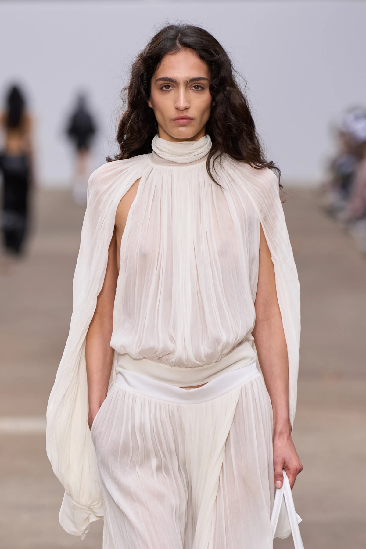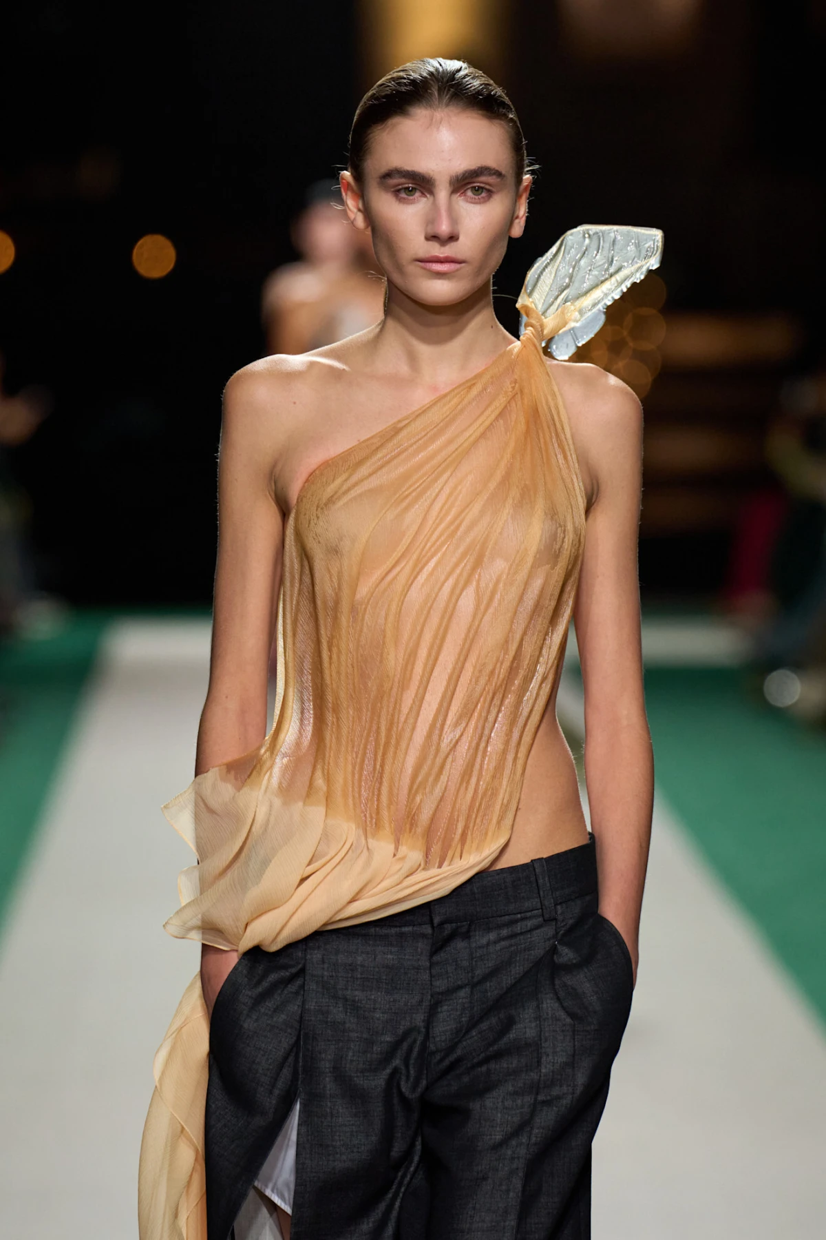 Budite odvažni s monokromatskim outfitom u kojem prozirni gornji dio vodi glavnu riječ. Kombinirajte prozirnu bluzu s odgovarajućim grudnjakom i hlačama, a izgled upotpunite minimalnim dodacima za uglađen stil.