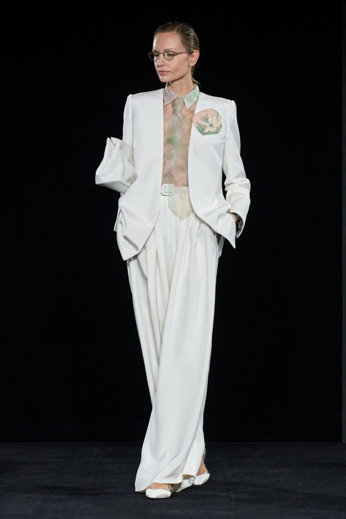 Od otvaranja s meko krojenim bijelim odijelom, koje je u već uobičajenom Armani stilu isijavalo jednaku dozu kontrole, moći i mekoće, kolekcija je postala poput lente vremena svega recentnog i davnog što je Armani prikazao u sklopu svoje Privé linije. To je možda i jedina zamjerka ovoj kolekciji – puno ideja, malo prostora za njihovu izvedbu. Naravno, nije bilo komada koji nije minuciozno vizualiziran, skrojen, izvezen i stiliziran tako da svaki dobije svojih 5 minuta, no vrlo brzo i žestoko smo oscilirali između dnevnog, glamuroznog, ležernog i noćnog dijela. Giorgio Armani je, ipak, kao i njegov suvremenik koji nas je nedavno napustio, bio poznat po rigoroznoj kontroli i pročišćavanju svake niti do savršenstva. Ništa se ne prepušta slučaju, ni poredak izlaza, a kamoli njihova namjena u životu i ormaru klijentica.