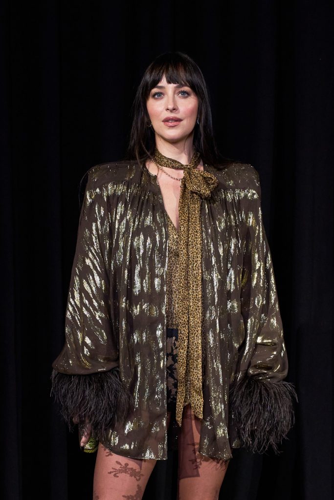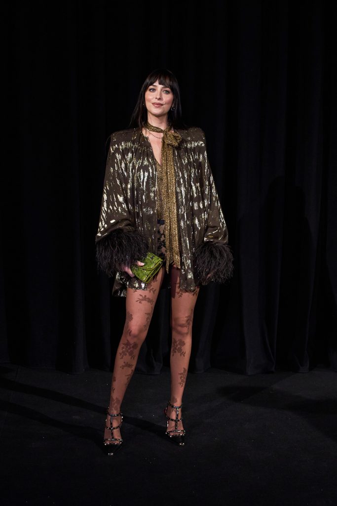 Dakota Johnson je na Valentino reviju stigla je u perju, cvjetnim najlonkama i šiljastim Rockstud salonkama.