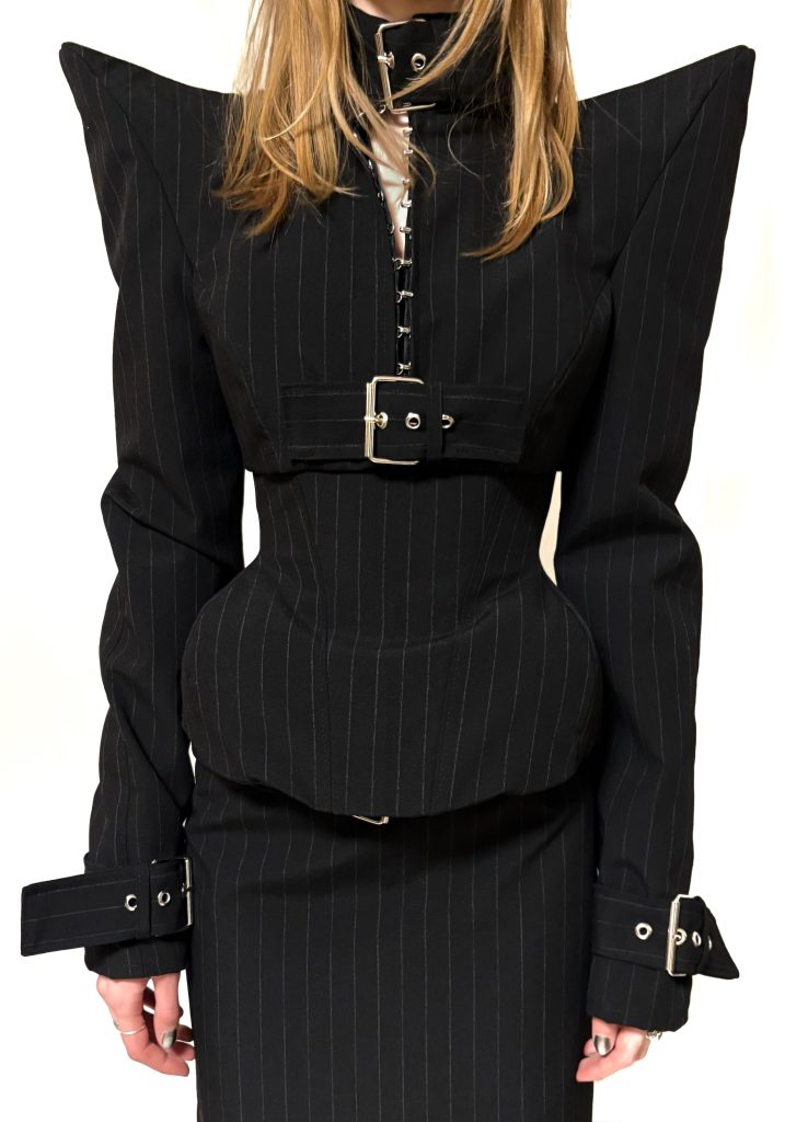 Proces izrade trajao je sedam tjedana. Sve sam radio sam, apsolutno do posljednjeg detalja. Kolekcija se sastoji od otprilike 25 odjevnih komada koji čine 12 lookova. Ni na jednom komadu nisam proveo više od nekoliko dana, no možda je najkompleksniji distressed denim set koji se sastoji od strukiranog sakoa sa šiljastim ramenima i pencil suknje.